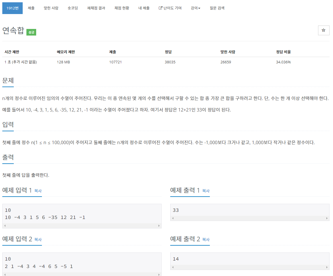 아래의 조건을 모두 만족할 경우에는 i번째 위치까지의 연속합은 i-1번째 위치까지의 연속합과 i번째 값의 합